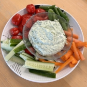 Server i en lille skål sammen med grøntsager eller rugbrøds chips