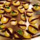 Skær auberginerne i 1/2 cm tykke skiver på langs(jeg brugte et mandolin), og læg dem på bagepapir på en bageplade. Aubergineskiverne sættes i ovnen i 20 minutter, indtil de let gyldne.