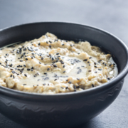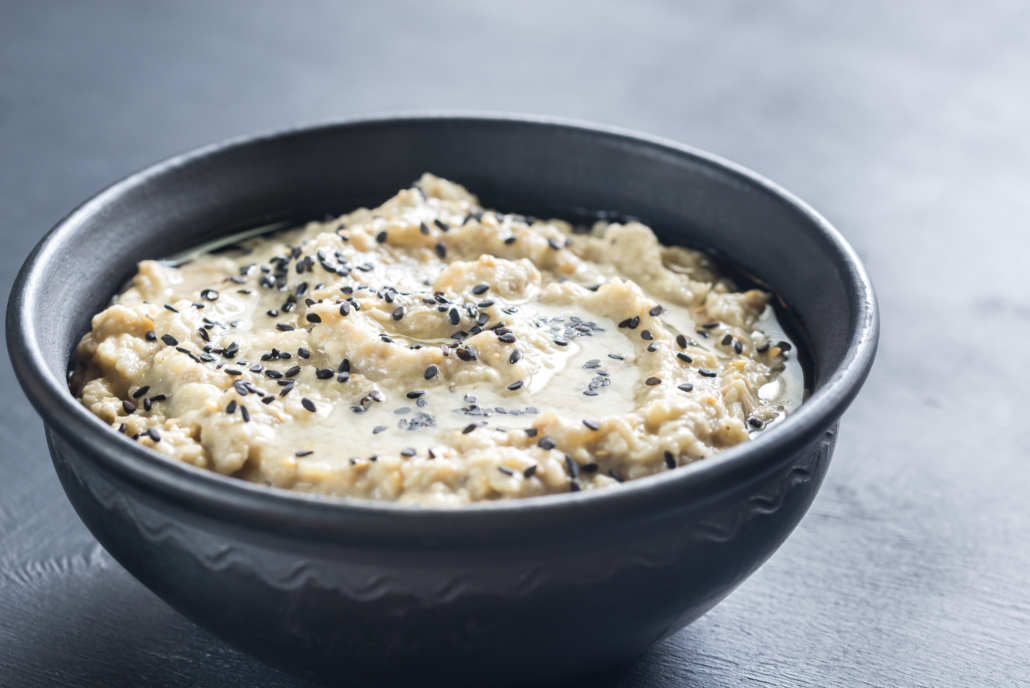 Lav et par huller med et tandstikker i aubergine og arranger den på bagepapir i ovnen ca. 30 min.indtil den er mørk og rynket. Skrab det varme auberginekød og blend det med de andre ingredienser. Servere det med tør ristet sesamfrø