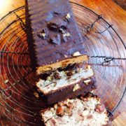 Smelt smørret og pisk det sammen med æg og bananer til en jævn masse. Tilføj mel, bagepulver, salt, vanilje og kanel. Piskes til en ensartet masse. Skær dadlerne i små stykker og hak mandlerne groft. Vendes i dejen og hældes i en smurt rugbrødsform. Skal være ca 35 min i ovnen i 30 min, check med en gaffel. Når den er færdig hældes smeltet chokolade på – et lille tip er smelt chokoladen med lidt kokosolie. Ind i køleskabet til chokoladen er størknet.