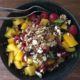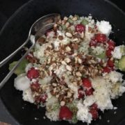 Blomkålen findeles til ris i en foodprocessor. forårsløgen skæres i fine skiver, jordbærene skylles og kommes i salaten med den skylede rucola