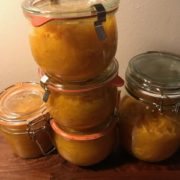 Hokkaido og æbler skrælles og rives. Herefter kommes det i en gryde med ingefær, citronsaft, citronskal, appelsinsaft, appelsinskal, vanilje og vand.