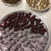 Bland alle ingredienser sammen, form dem som kugler, som det er vist på det nederste billede. Stil dem til side. Smelt mørk chokolade og rul kuglerne forsigtigt i.Pynt med frysetørret hindbær.