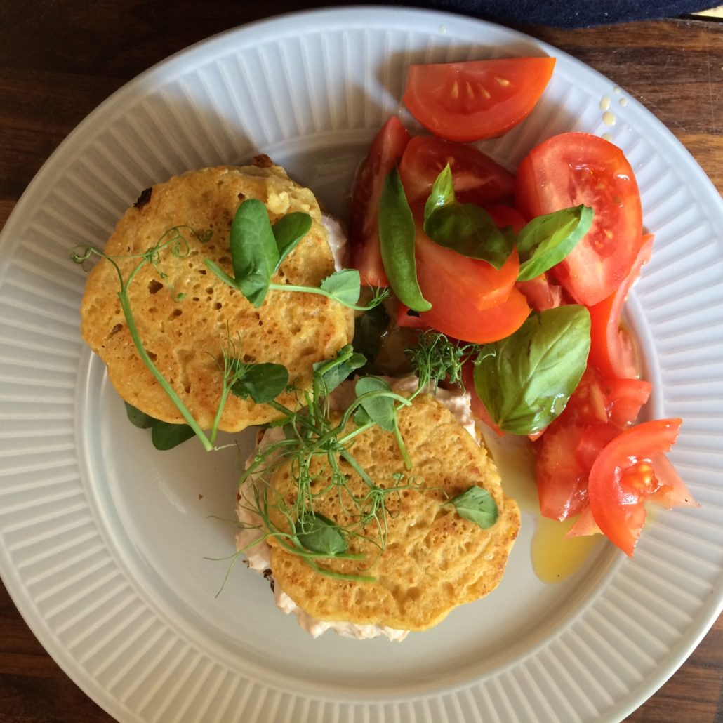 Bland tun med mayo, skyr. Servere pandekagerne med tun og en tomatsalat