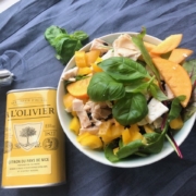 Bland det hele sammen og smag det til med olien, skal dun have salaten med på arbejdet, så tag olien med for sig selv.