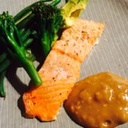 Laks med grøntsager med en sød tahin