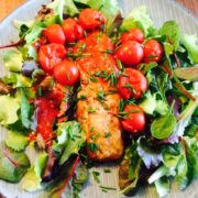 Skyl salaten og anret fisken og tomaterne oven på salaten, hæld lidt citron olie over og pynt med salt, peber og purløg.