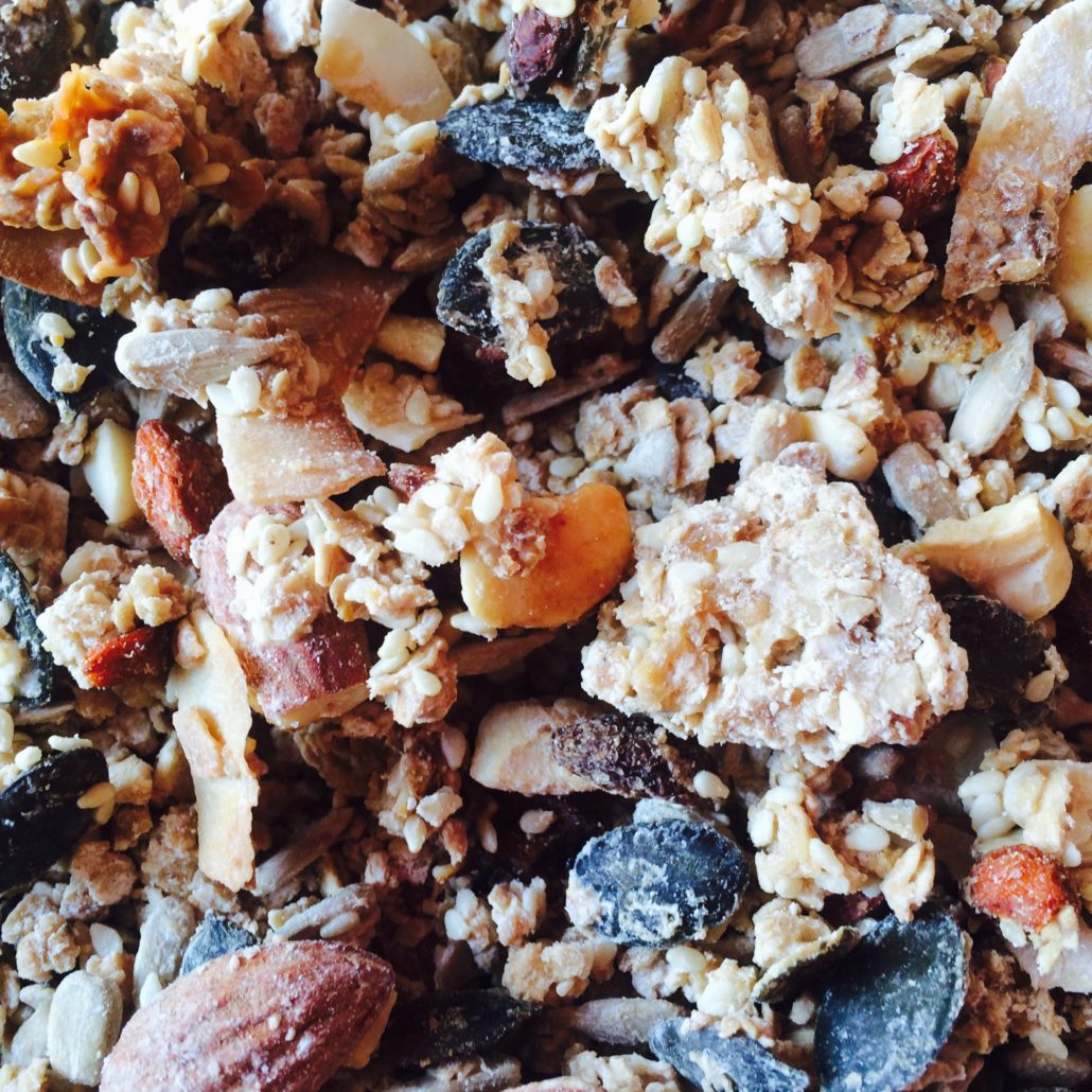 Bland havregryn, kerner, frø og nødder i en skål og sæt det i ovnen på 180 grader i 8 min.