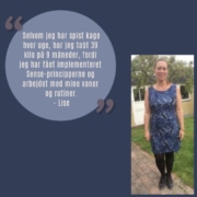 Jeg har selv oplevet at gå rundt i alt for mange år og føle mig utilstrækkelig, at negative og destruktive tanker om mig selv tog overhånd og overskyggede alle livets glæder. At disse tanker satte en dæmper for min egen formåen og realisering af drømme. Heldigvis har jeg også oplevet, at det er muligt at bryde de destruktive tankemønstre og opnå drømme, som man ellers har tænkt var urealistiske og uopnåelige, endda uden, at man behøver at lægge hele sit liv om og sætte restriktioner for sig selv. Fremfor at udsætte sig selv for miserable restriktive slankekure, gælder det i stedet om at få ændret sine kostvaner, rutiner og mønstre, hvis man gerne vil opnå et større vægttab, som man kan holde på den lange bane. Ingen kan holde ud at leve af broccolisuppe eller juice resten af livet, men alle kan til gengæld holde ud at leve efter Sense-principperne. Sense er nemlig en livsstil, som ikke sætter begrænsninger og restriktioner mod bestemte fødevarer, men i stedet tillader alt, så længe man blot spiser intuitivt og arbejder med sine vaner og mønstre.