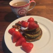 Pisk alle ingredienserne sammen og steg pandekagerne på lavt blus i lidt smør. Top pandekagerne med frugt og nødder.