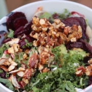Bland grønkål, puckost, avocado og pære sammen, derefter vend de bagte rødbeder i og top med ristede mandler