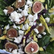 Skyl og snit salaten(jeg brugte rester af spinat, rød spidskål og hjertesalat). Boost det med de stegte squash, feta og figner i skiver. Top det med dressingen lige før den skal spises.