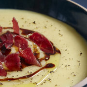 Skræl grøntsagerne, snittes groft og læg dem i en gryde. Tilføj vand så grøntsager er dækket. Bringes i kog og koges videre ved svag varme omkring 30 minutter, indtil de er møre. Blend det hele og tilsæt mælk og fløde. Smag til med salt og peber. Læg forsigtig mørbraden på en pande uden fedtstof. Tilføj olierne og servere mørbraden til suppen. Drys til sidst frisk peber hen over.
