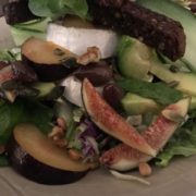 Denne ret fik jeg i Paris for mange år siden på en lille cafe, i dag forsøgte jeg at genskabe den og det fortrød jeg bestemt ikke. Honning, valnødder og Gedeost er en perfekt kombination. Sødmen fra honningen spiller op til den skarpe gedeost i denne salat blandet med syrlige blommer.