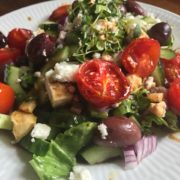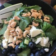 Det hele blandes sammen og toppes med feta og cashewnødder