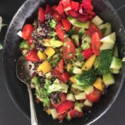 Broccolien koges 2-3 min, spinatten skylles grundig, tomaterne halveres og salaten blandes. Jeg koger gerne quinoa til flere dage skal have ca. 15 min, smager dejligt i salaterne.