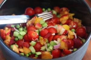 Avocado, tomater, rødløg, agurk, ærter og nektariner.