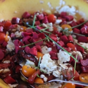 Skyld grøntsagerne og bland det sammen med de bagte top det med en dressing af olie og balsamico og frisk timian.