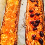 Pisk smørret luftigt og tilsæt ægget i lidt af gangen – tilsæt smuldret brød, mandelmel og hvidløg. Vend forsigtig ricottaost, parmesan, timian og salt i. Stil skålen til side. Rul butterdejen ud i 2 aflange stykker og hæld osteblandingen over, dog ikke helt ud til kanten. Skær tomaterne i tynde skiver og læg dem i lagvis, så der er 2 pæne rækker. Hæld halvdelen af olivenolien over tomaterne og pynt med oliven, salt og peber.